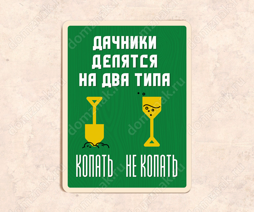 Табличка «Дачники деляться на вида типа: копать, не копать.» изготовлена из пластика ПВХ, толщиной 4 мм. Изображение наносится по технологии УФ-печати. Табличка предназначена для использования как в помещении, так и на улице.